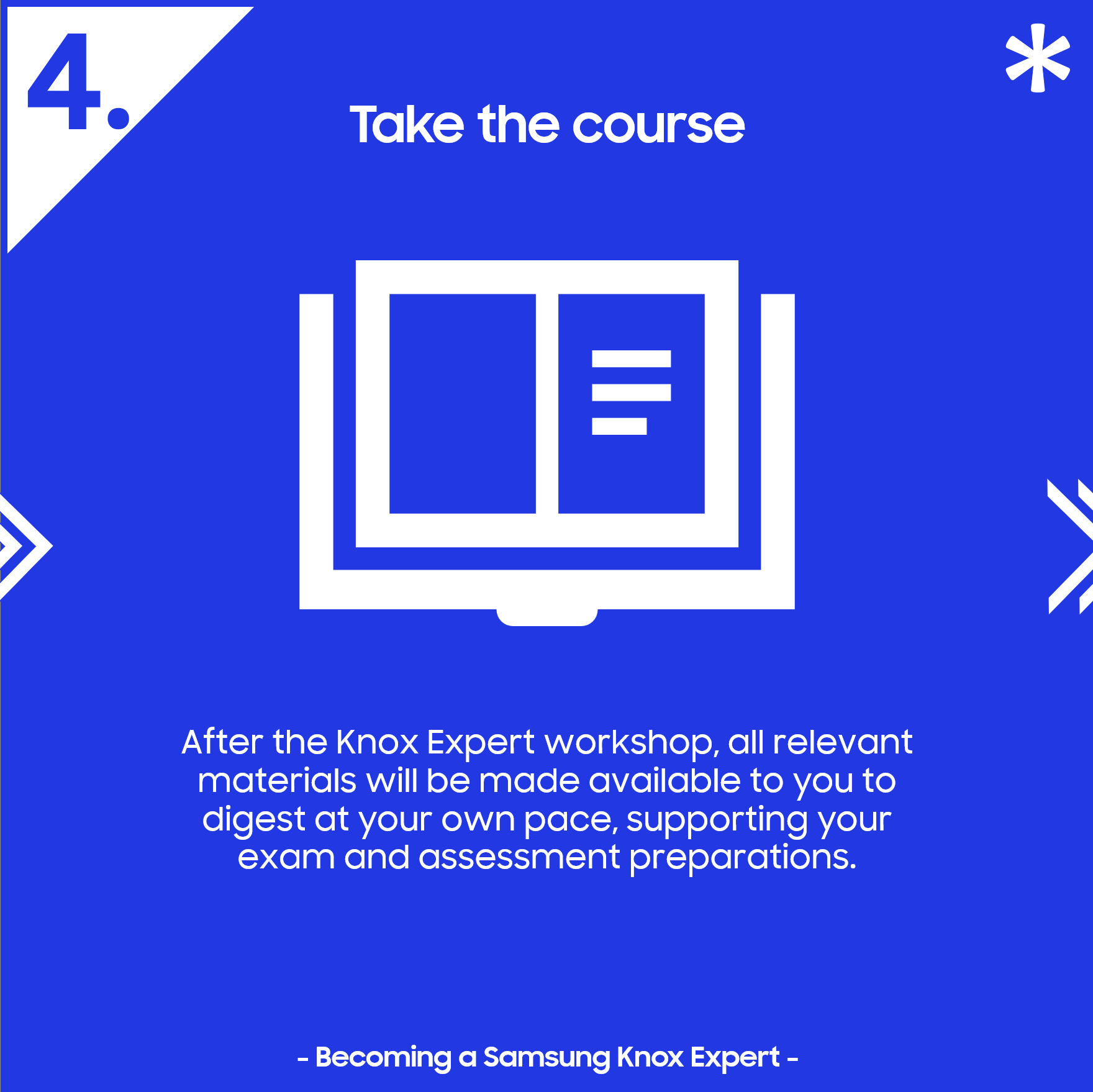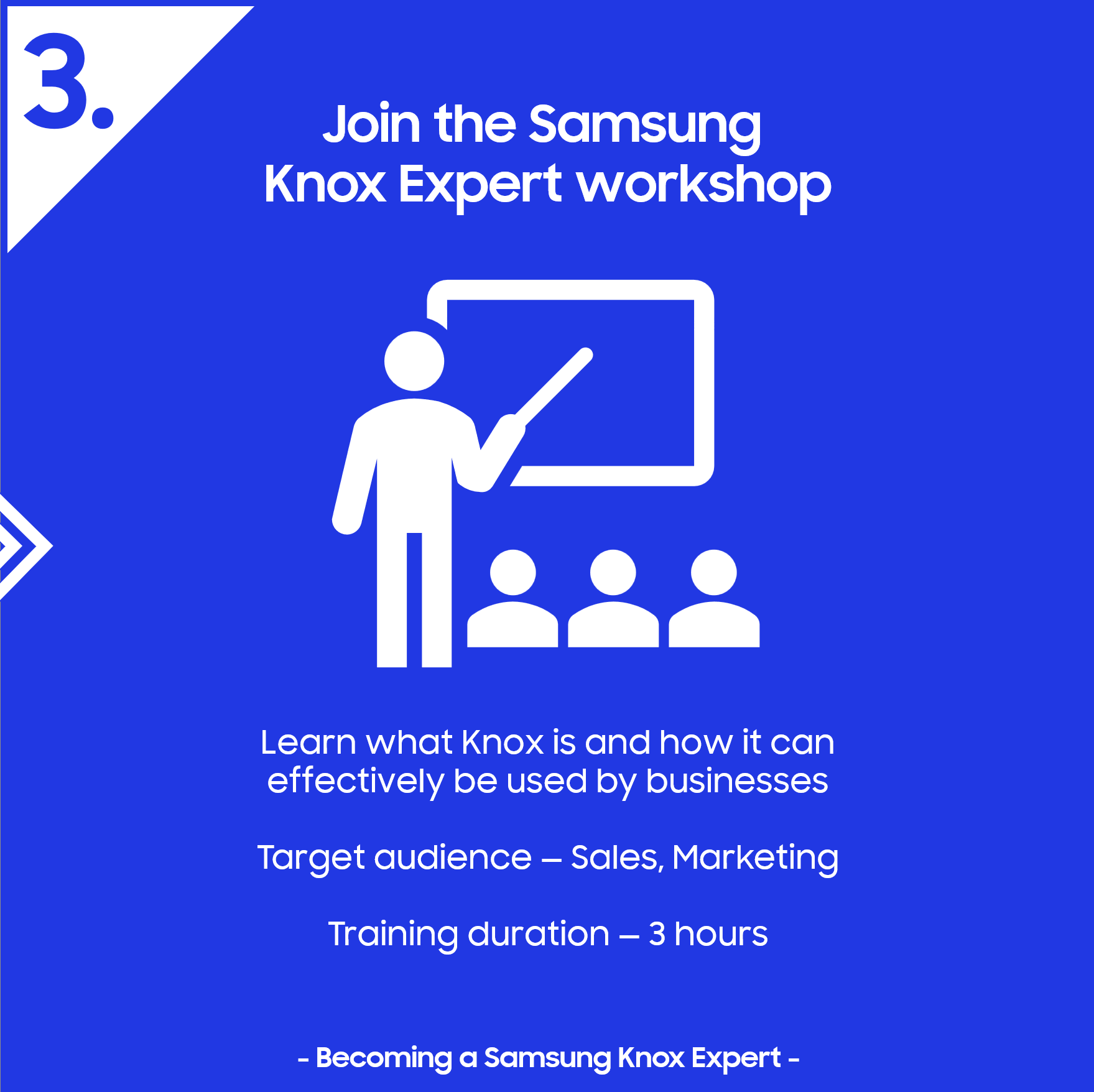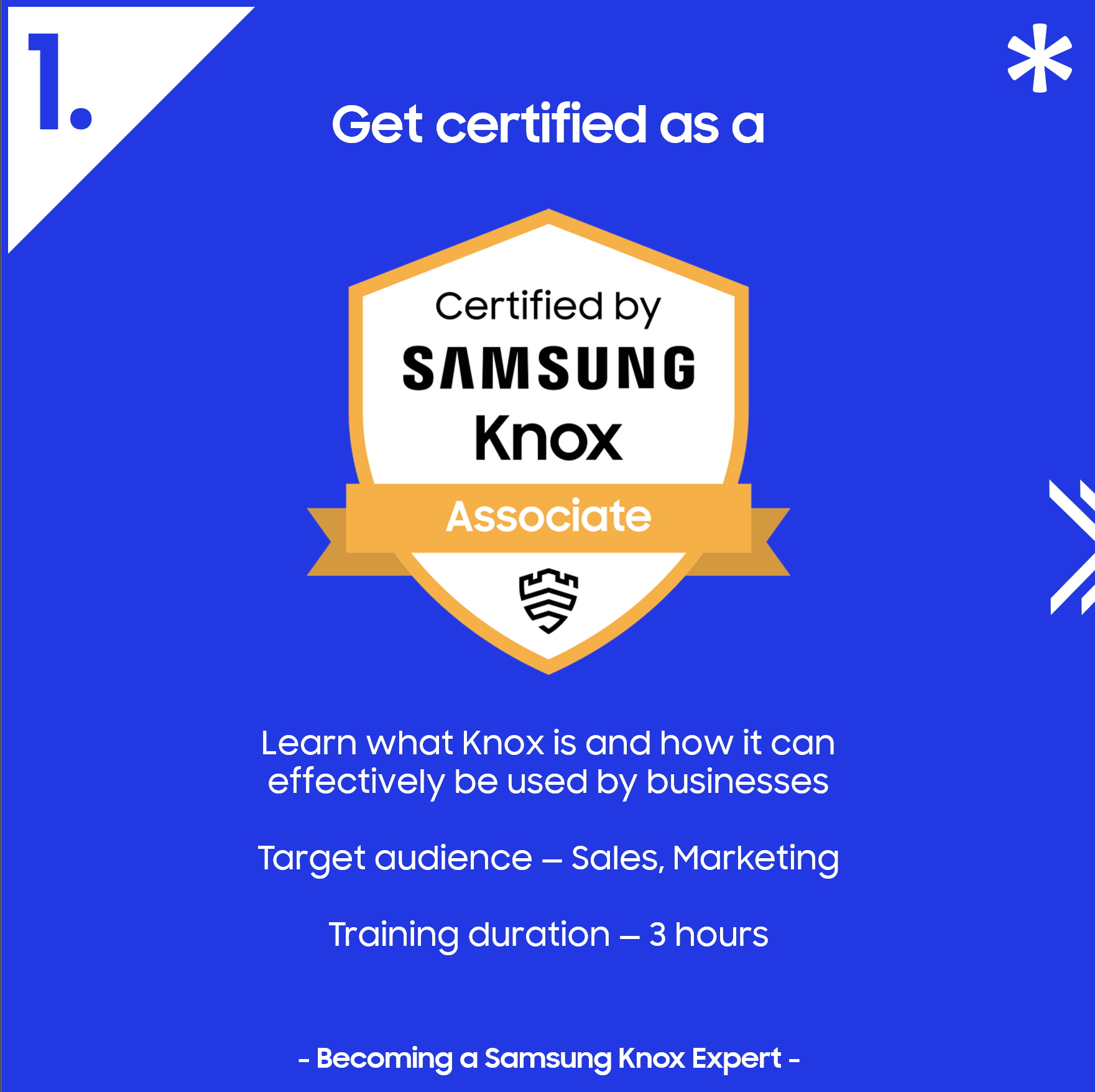 The Knox Expert course launches in January and will be accessible through the Samsung Business Academy (SBA). If you participated in the European session but are from another region, we recommend discussing the availability of the Knox Expert program with your regional Samsung representative.